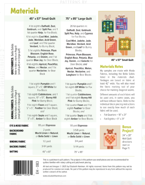 These forest friends are excited to show off their latest finishes at tonight's guild meeting! The fat quarter-friendly pattern includes instructions for making three quilt sizes including 4 different animals (foxes, bunnies, deer, and bears) and their 12 different patchwork quilts.