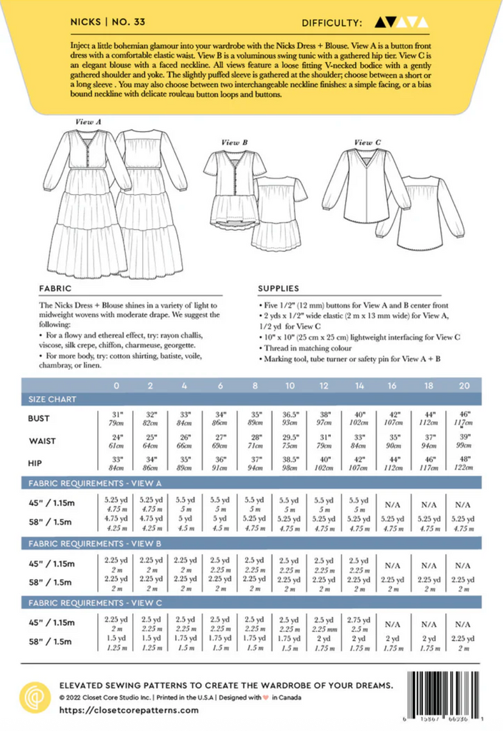 Add a touch of bohemian elegance to your wardrobe with the Nicks Dress + Blouse. Offering multiple variations with gentle gathering and delicate touches, it's rewarding to construct and delightful to wear. Each view showcases a loose-fitting V-necked bodice with a softly gathered shoulder and yoke. The gently puffed sleeve is gathered at the shoulder; select a short sleeve or a long sleeve with wrist pleats for shaping and an elastic gathered cuff. Choose between two interchangeable neckline finishes: a simple facing or a bias-bound neckline with delicate rouleau button loops and buttons.