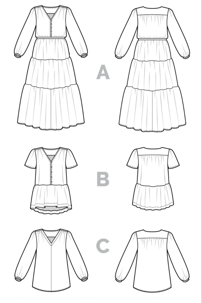 - View A presents a button-front dress with a comfortable elastic waist, long or short sleeves, and three gathered skirt tiers.