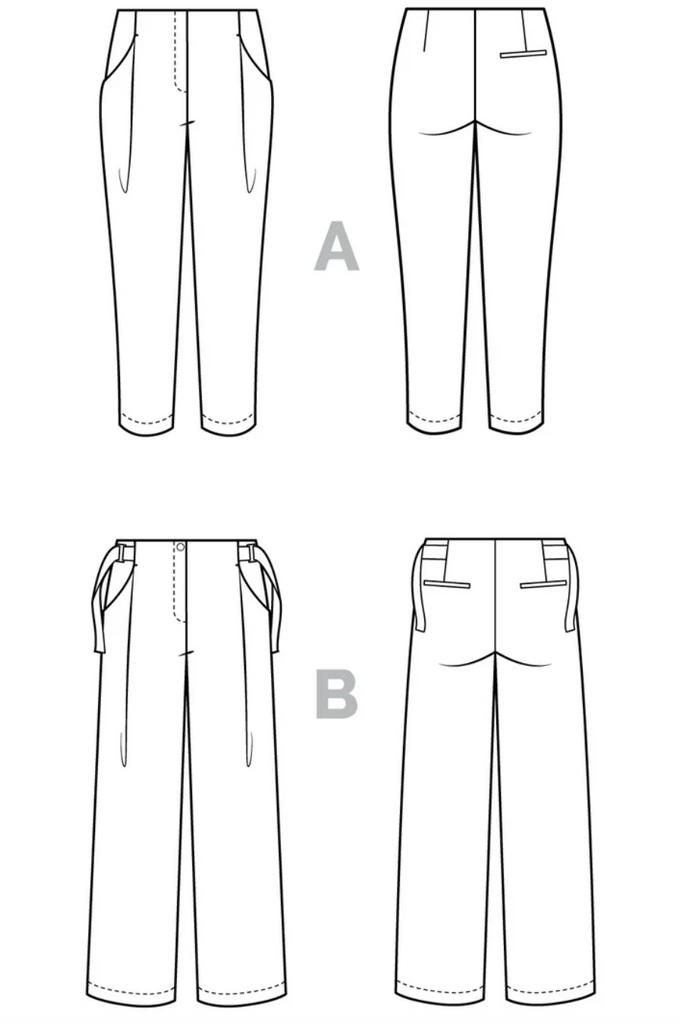 Drawing inspiration from an iconic songwriter with enduring style, Mitchell presents a contemporary interpretation of classic pleated trousers. Refined and comfortable with particularly distinctive details, they're destined to become your new favorite bottoms. Each view is high-waisted with a fly front zipper and a comfortable hidden waistband facing creating a sleek continuous line through the rise. Deep front pleats enclose a distinctive angled pocket. Darts provide shaping in the back, with optional back welt pockets. Select a tapered or wide leg, or add an optional adjustable waist tie secured with D-rings or a slider.